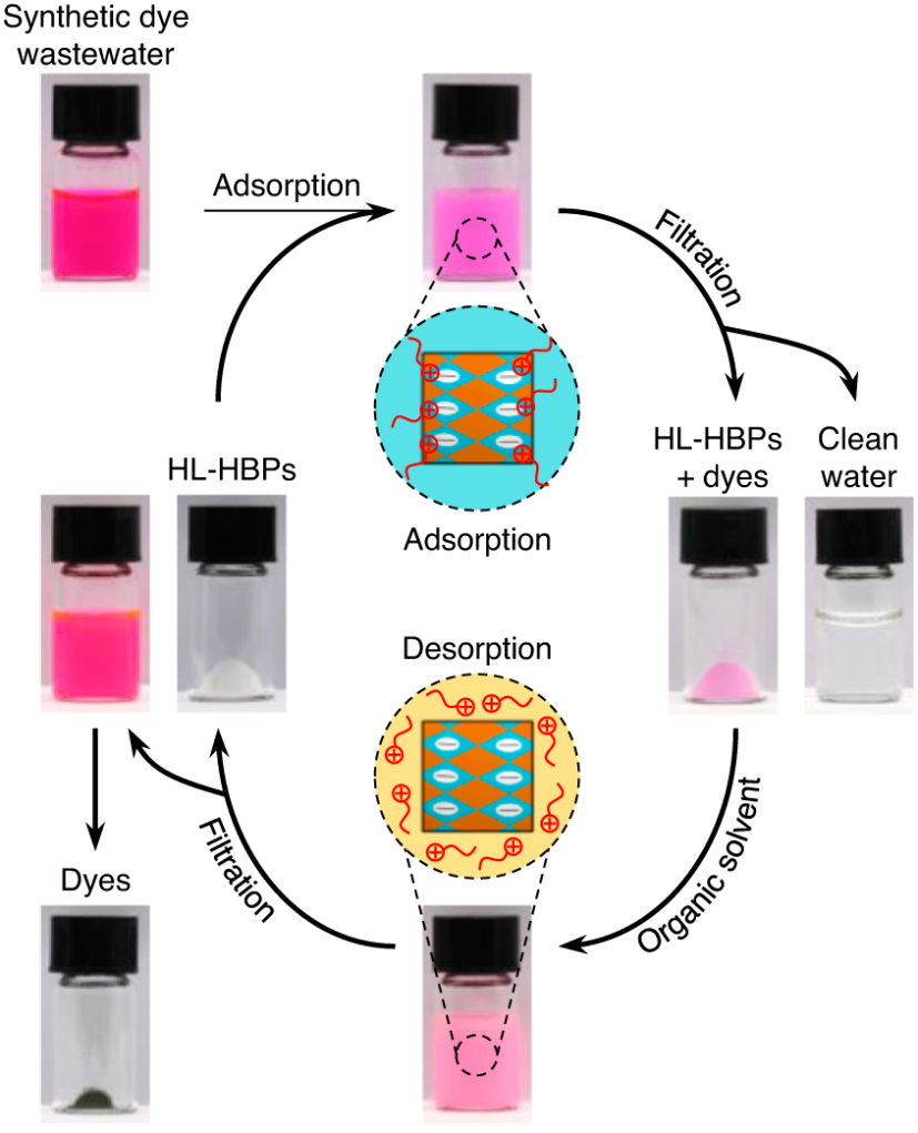 在此基础上,科研团队发展了一种从含有机染料的废水中分离回收染料的策略:首先,染料在废水中被吸附到微球上;再将吸附了染料的微球分散到有机溶剂中,染料从微球脱附,被有机溶剂溶解;此后,通过蒸馏去除有机溶剂,回收染料。