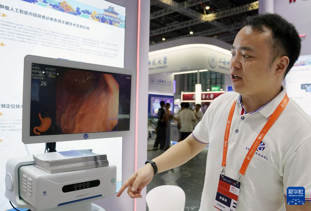 工博会高校展区,武汉大学的展台工作人员介绍消化道肿瘤人工智能内镜筛查诊断系统。新华社发(刘颖 摄)