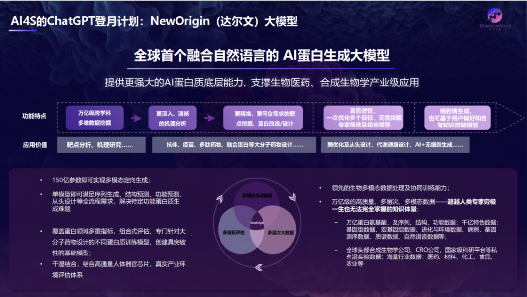 许锦波介绍,NewOrigin大模型拥有百万级参数,学习了万亿级高质量、多层次、多模态的大数据,融合自然语言与蛋白语言,力图高精度、低门槛、高通用性地满足创新药设计、合成生物学等真实产业应用需求,大幅提升蛋白质设计的效率和成功率。NewOrigin大模型基于条件生成机制,联合使用AI、分子动力学、量子计算、湿实验等多维反馈机制,可高精度生成蛋白质序列、蛋白质功能、蛋白质知识表示等多种模态蛋白质内容,完成亲和力、稳定性、活性、表达量等多维度任务,满足真实的产业应用所需。而融合自然语言的交互方式,将极大降低使用门槛,让不具备AI算法能力的生物学家也可以快速上手。