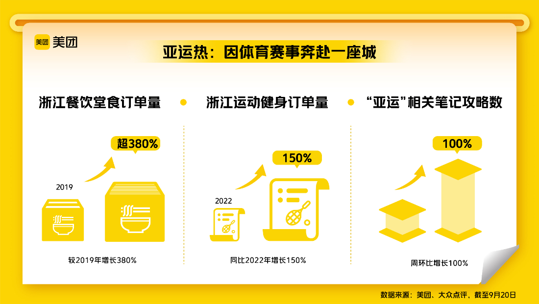 杭州本地的笔记博主们正通过大众点评分享观赛指南,为各地观众提供真实有趣的亚运出行攻略。近一周,大众点评上“亚运”相关笔记攻略数环比翻倍增长,杭州“City Boat”关键词搜索量环比暴增600%。亚运热带来全民运动热,截至9月20日,浙江地区在美团上的运动健身订单量同比增长超150%,球类运动、健身中心热度上涨最快。
