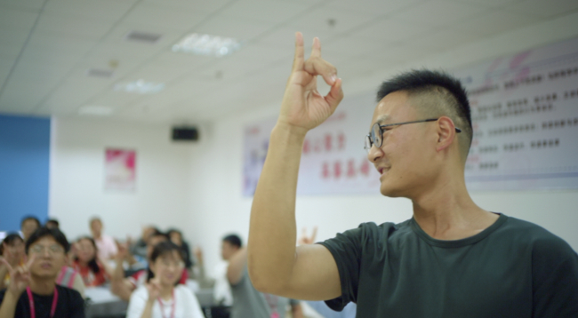 听课的同事们,认真的跟着王庆做着手语动作。虽然他们的手势一开始还不标准,但他们微笑着相互鼓励,彼此纠正,一遍又一遍地练习。