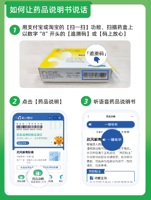10月23日重阳节当天,阿里健康联合阿里巴巴公益发挥数字技术优势,为9000多个国药准字药品的药盒添加了新功能。只要打开淘宝或支付宝扫描药盒上的追溯码或“码上放心”,点击“药品说明”,不仅可以查找到“大号字”的药品说明,如用法用量、适应症、不良反应、禁忌症等信息一目了然;还能体验语音播报功能,让药品说明“能看又能听”,有效解决老年人看不清、看不懂说明的带来的用药安全问题。