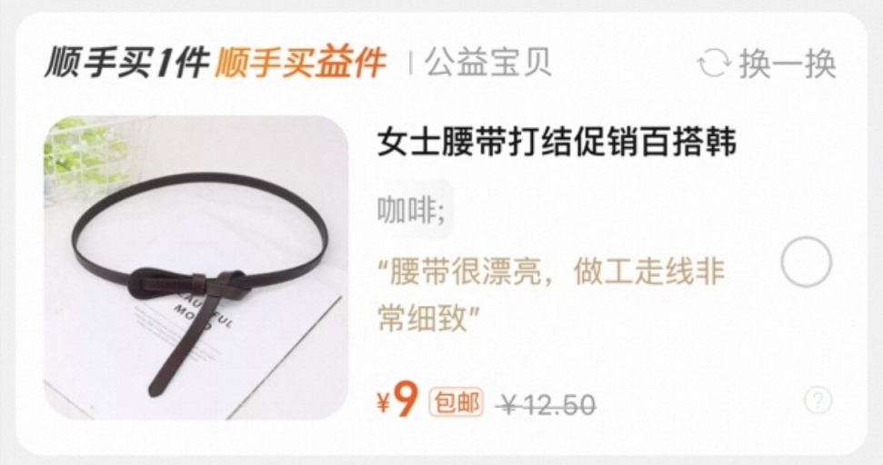据了解,“顺手买一件”是指消费者在购买商品进入订单结算环节时,可顺手买一件跨店包邮商品。去年年初,淘宝天猫新增了这一产品工具,所有商家可以在后台报名高性价比的商品加入。加入后的商品,将被推荐给从未购买过该品类的新用户。这一改变,使商家在没有额外费用投入的情况下,能带来新增交易。