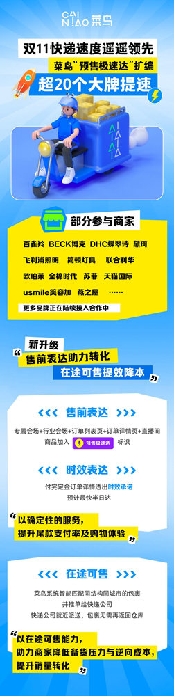 在市场不断认可的背景下,近年来,菜鸟“预售极速达”覆盖商家数量与城市数量也在不断增长。今年菜鸟“预售极速达”能力继续增强,不仅服务范围包括全国超300个城市,同时实现大件小件全覆盖。截至目前,已有约20个知名品牌确认今年天猫双十一使用菜鸟“预售极速达”,覆盖洗护、美妆、食品、消费电子、家装、电器、家居等品类,等多个行业头部品牌。10月31日晚天猫双十一开卖后,上述品牌的“预售极速达“订单将通过菜鸟速递极速送达。