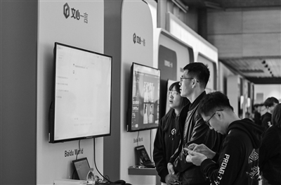 在近日举办的百度世界大会2023现场,参会者试用百度“文心一言”。 记者 张漫子 摄