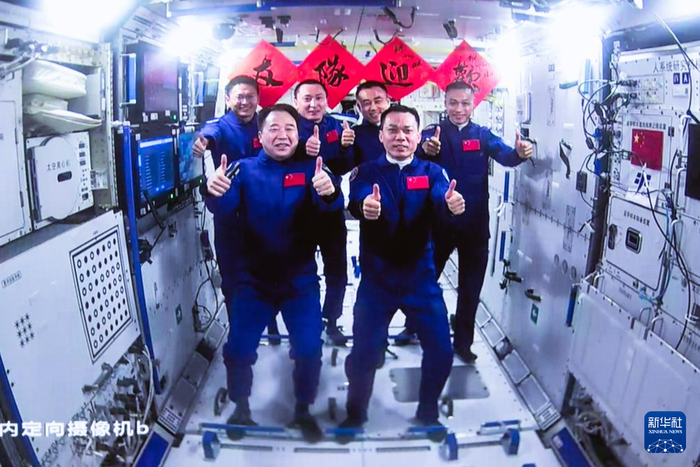 这是10月26日在北京航天飞行控制中心拍摄的神舟十六号航天员乘组与神舟十七号航天员乘组“全家福”。