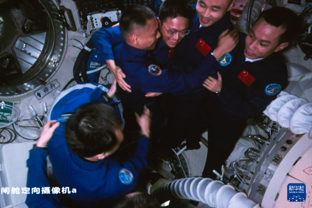这是10月26日在北京航天飞行控制中心拍摄的神舟十六号航天员乘组与神舟十七号航天员乘组拥抱的画面。