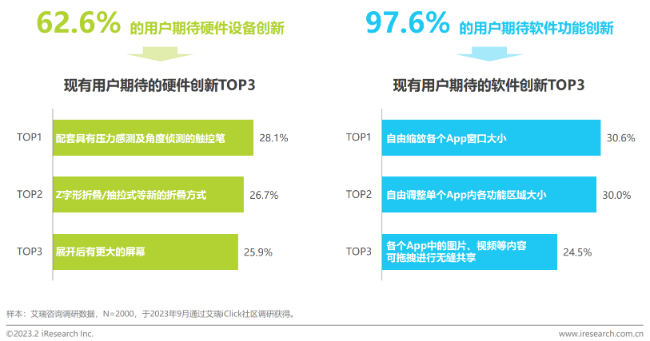 《报告》指出,97.6%的折叠屏手机现有用户更期待软件方面创新,即基于展开后大屏优势充分挖掘软实力,提升用户在娱乐/办公/学习等方面的使用体验。