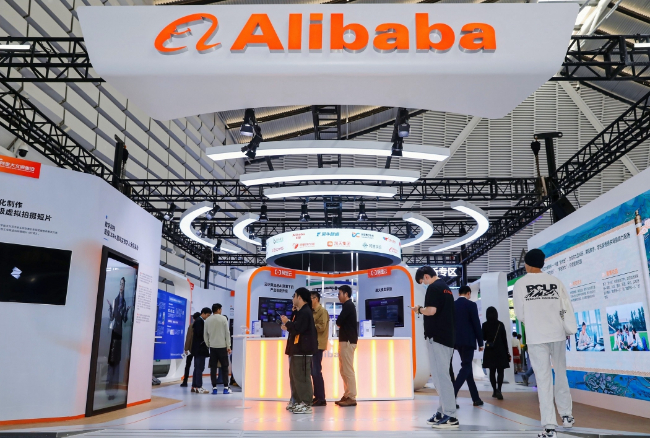 2023年世界互联网大会乌镇峰会开幕,图为阿里巴巴展台,展出了阿里围绕AI的科技平台能力。