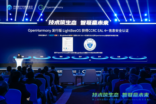 在大会现场,OpenHarmony项目群工作委员会代表、华为终端BG软件部副总裁柳晓见公布了证通电子研发的操作系统LightBeeOS通过中国网络安全审查技术与认证中心CCRC的审查认证,获得EAL(Evaluation Assurance Level)4增强级信息安全认证的消息,此项认证的通过说明基于OpenHarmony打造的LightBeeOS的信息安全保障能力,在国产操作系统中达到了行业较高水平。这也是获此证书的OpenHarmony行业发行版。
