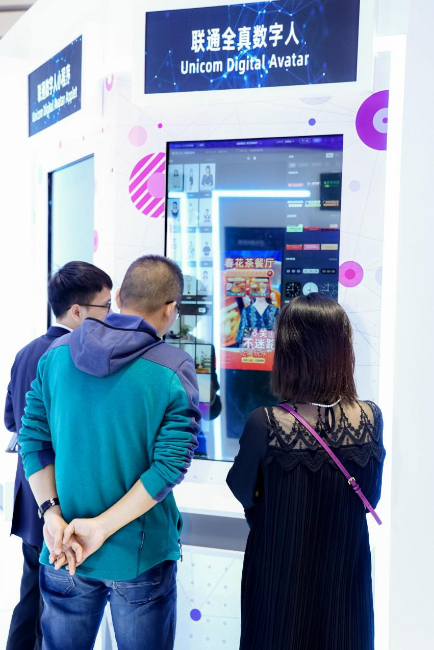 展区入口,一面落地大屏展示着来往观众自己制作的数字人形象,通过“联通数字人”小程序,观众仅需拍摄一张自己的形象照片,即可实时生成专属的虚拟数字人形象。同时,数字人直播平台配置定制全真主播数字人形象,可结合文本AI发声、语音形式驱动数字人进行7*24直播互动,为“双十一”直播加油助力。