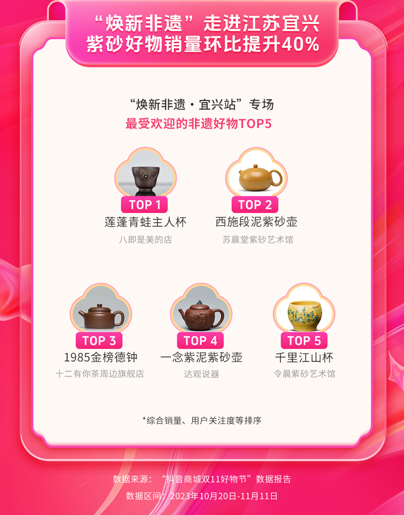 平台关注文化消费市场,双11期间落地了“焕新非遗”江苏宜兴站活动,在展示紫砂陶制作技艺和非遗知识的同时,促进相关产品销售。报告显示,活动期间,抖音电商里的紫砂好物销量环比提升40%。莲蓬青蛙主人杯、西施段泥紫砂壶、1985金榜德钟、一念紫泥紫砂壶和千里江山杯成为最受平台消费者青睐的手工艺产品。