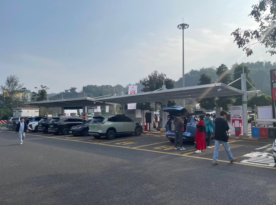 以蜀道集团雅康高速天全服务区蜀道新能源超充站为例,该站A、B区分别由1台充电主机、2个超充终端和3个快充终端组成,能够同时为8辆车进行充电,并能够根据需求,持续升级演进。上线运营以来,日均服务次数约100车次,日均充电量约2200度,超快充总体运营情况良好,基本达到投资预期,即便是假期遇上客流高峰,也能够从容应对。后期,蜀道新能源公司将根据实际需求对超快充进行扩容,提升主机总功率,进一步提升充电速度。