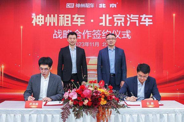 11月16日,神州租车与北京汽车正式签署战略合作协议,旨在携手探索围绕新车型、新场景、新服务的合作空间,结合各自优势为出行市场提供更多样化的选择。神州租车CEO杨楠、北京汽车总裁宋玮出席并见证签约仪式。