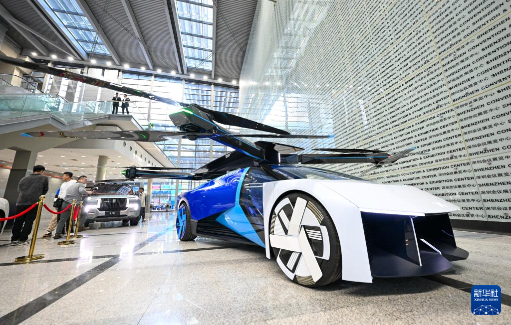 11月15日,在第二十五届高交会上,机臂、旋翼等飞行系统可以完全折叠收纳的小鹏汇天陆空一体式飞行汽车对公众展出。