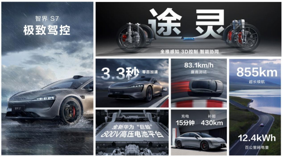 全新DriveONE 800V碳化硅高压动力平台,让智界S7拥有3.3s的0-100km/h加速成绩。得益于0.203Cd的超低风阻和高效动力,智界S7百公里综合电耗仅12.4 kW·h,CLTC综合续航里程可达855km。800V超级快充充电5分钟即可增加215km续航。首发搭载华为途灵智能底盘,通过四大核心技术加持,配合自适应空气悬架系统,提供更安全、舒适的驾乘体验。