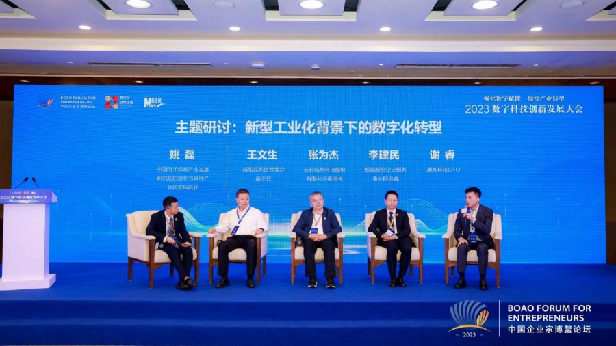 随后,姚磊邀请咸阳高新区管委会副主任王文生、云宏信息科技股份有限公司董事长张为杰、视源股份企业服务事业群总裁李建民、以及趣丸科技CTO谢睿针对新型工业化背景下的数字化转型共同探讨。