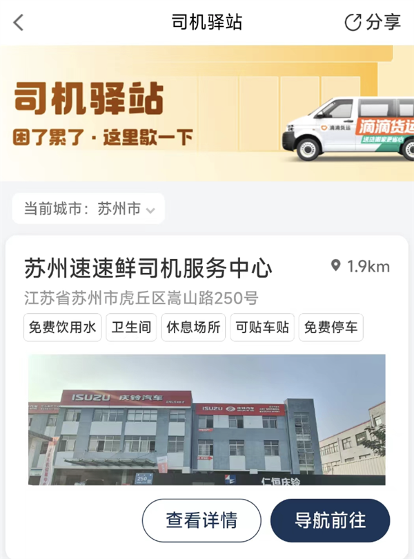 本月初,“司机驿站”在滴滴货运司机端App正式上线,首期已覆盖23城,有超100个司机服务中心运营服务。司机师傅可登陆滴滴货运司机App,在常用工具里点击“司机驿站”,查看所在城市的司机驿站及服务内容,一键导航前往。目前所有司机驿站都提供免费卫生间、饮(热)水、手机充电、无线上网,部分司机驿站还提供免费急救药箱、汽车玻璃水、维修工具等紧急服务。