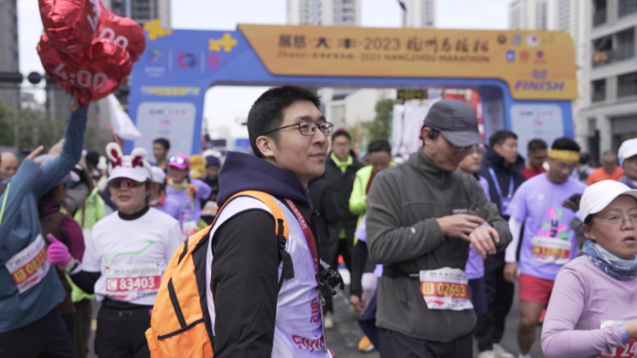 袁芳芳跟着选手跑完半马,终点拱门处,身背AED的志愿者是她的老同事何林,负责赛道急救保障。