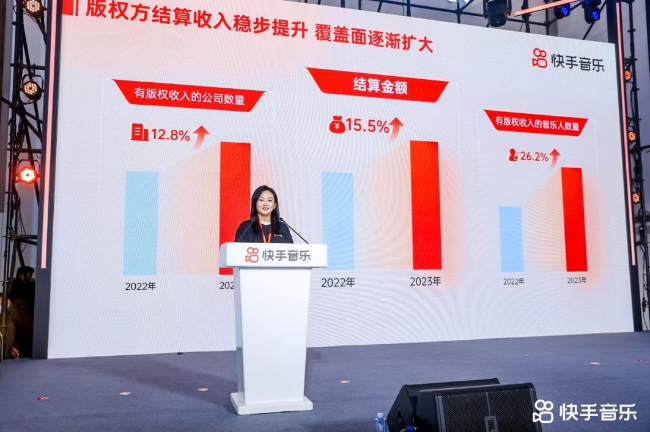 于蓝透露,2023年,快手累计已为30家版权方促成了歌曲商业化场景合作,版权方音乐结算的总金额同比上涨15.5%。