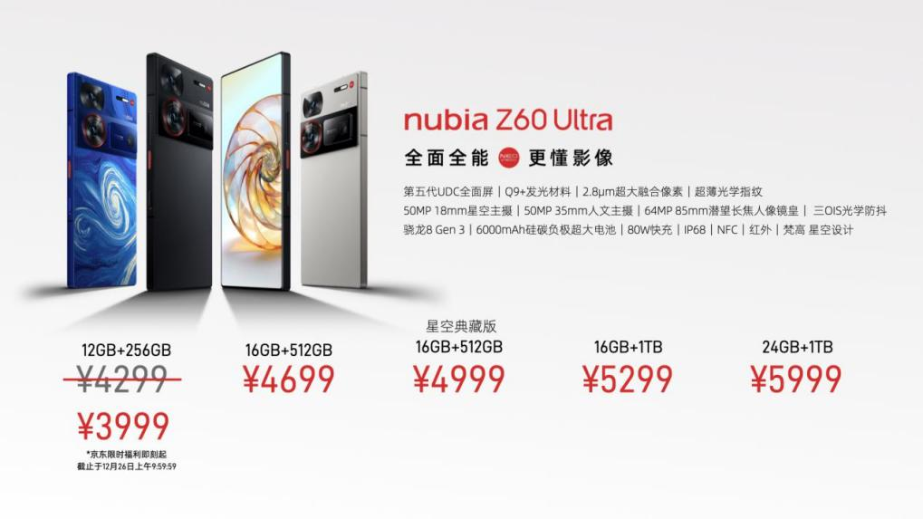 12月19日,努比亚Z60 Ultra正式发布。新机推出NeoVision泰山影像系统——高定光学三主摄;全新UDC柔性全面屏,支持第五代屏下摄像技术,显示更出彩;配备骁龙8 Gen3三件套,释放性能、6000mAh硅碳负极大电池、IP68级防尘防水以及轻量纯净的MyOS14系统。