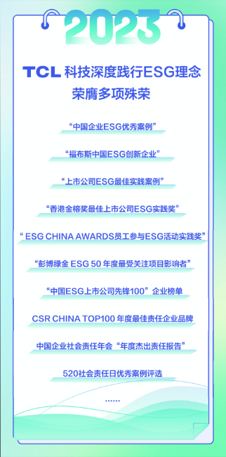 2023年,TCL科技凭借在ESG领域出色的实践表现及系列成就,获得 “福布斯中国ESG创新企业” “中国企业ESG优秀案例”“ 上市公司ESG最佳实践案例”“ ESG China Awards 员工参与ESG活动实践奖”“香港金榕奖最佳上市公司ESG实践奖” “彭博绿金ESG 50年度最受关注项目”等多项荣誉。