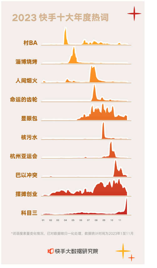 12月26日,快手大数据研究院发布2023快手十大年度热词,分别为:村BA、淄博烧烤、人间烟火、命运的齿轮开始转动、显眼包、核污水、杭州亚运会、巴以冲突、摆摊创业、科目三。据悉,年度热词基于快手平台搜索和热点指数综合排名后产生,“十大年度热词”反映出短视频作为一种新兴的媒介形态,在拓宽大众自我表达途径的同时,也在客观上记录生活、记录时代。