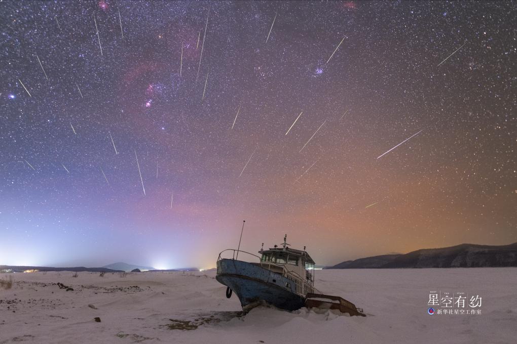 黑龙江星空摄影爱好者王宝勋2022年1月3日在黑龙江牡丹江镜泊湖景区拍摄的象限仪座流星雨(多张叠加)。(本人供图)