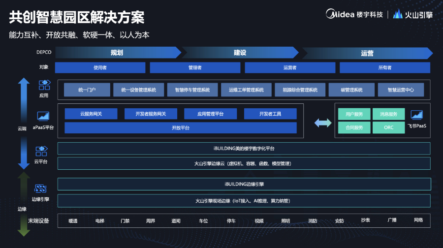 云边端三层架构中,末端设备层是暖通、电梯、门禁、车位、照明、安防、广播、网络等基础设施,这些智能设备采集到的海量数据汇聚融合到中间的边缘层,由美的iBUILDING边缘引擎和火山引擎现场边缘共同进行边缘侧存储、管理和智能化分析,再将预处理和分析后产生的高价值数据传送到云平台,基于iBUILDING美的楼宇教字化平台和火山引擎边缘云的协同运作,以精细化、全周期管理实现园区高效、智慧、绿色运行,满足园区使用者、管理者、运营者、所有者的多样化需求。