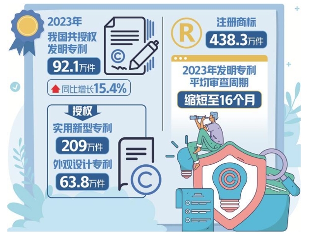 成果转化、依法保护、审查授权……知识产权效益显现离不开知识产权专利体系的支撑与赋能。2023年我国共授权发明专利92.1万件,同比增长15.4%;授权实用新型专利209万件、外观设计专利63.8万件;注册商标438.3万件,登记集成电路布图设计1.13万件;达成专利开放许可1.7万项;我国通过PCT、海牙、马德里体系分别提交专利、外观设计、商标国际注册申请73812件、1166件(前11个月)、6196件,稳居世界前列。
