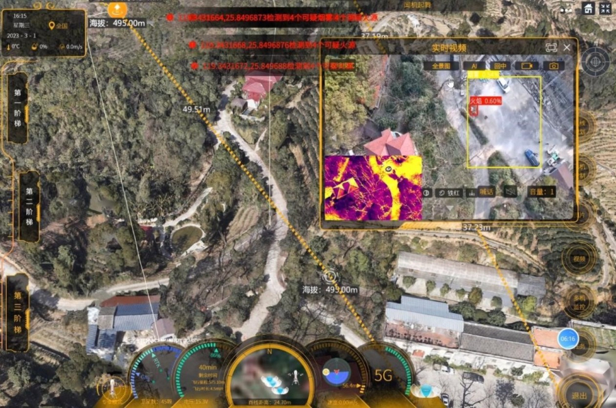 云圣智能虎视四维全息管控平台具备物联网IoT设备的接入能力,可实现地面传感器数据与无人机空中拍摄数据整合。地面物联网loT设备发出预警信息后,系统将自动调度距离现场最近的机场联动查看。无人机同时搭载端侧AI,在巡检飞行中可基于双光拍摄对路径上的烟点、火点进行识别、定位、预警,及时通知地面工作人员进行处置。通过多元吊舱搭载的喊话器,无人机还可完成日常森林防火喊话宣传和火灾现场指挥救援等工作。