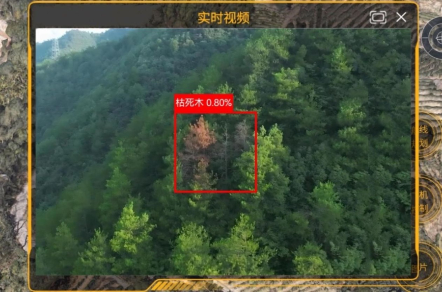 圣无人机第一视角实拍图,端侧AI自主识别林业病虫害枯死木
