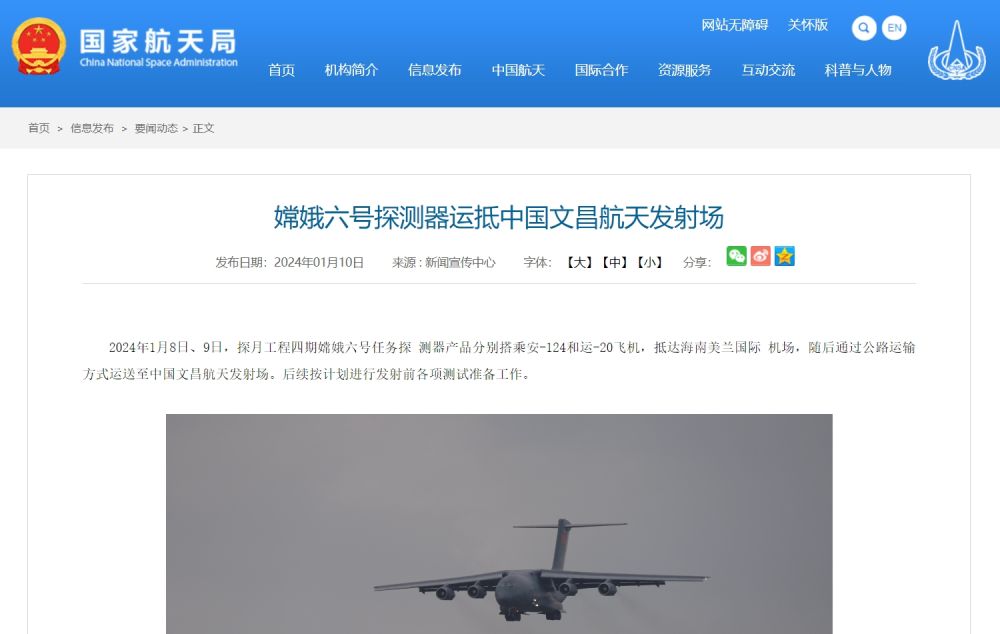 2024年1月8日、9日,探月工程四期嫦娥六号任务探测器产品分别搭乘安-124和运-20飞机,抵达海南美兰国际机场,随后通过公路运输方式运送至中国文昌航天发射场。后续按计划进行发射前各项测试准备工作。