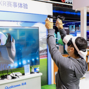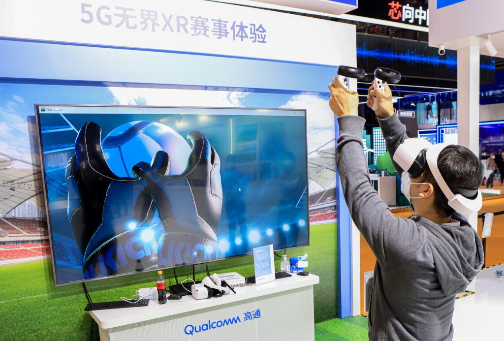 2022年11月7日,参观者在第五届进博会美国高通公司展台参与5G无界XR赛事体验。新华社记者 李京 摄