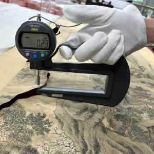 修复前,对《赵垓山水图轴》测试厚度。(受访者供图)