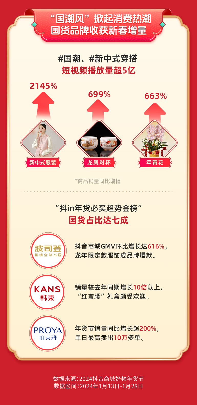 在“抖in年货必买趋势金榜”上,国货的占比达到了七成,不少品牌商家在活动期间赢得新春市场增量。波司登在抖音商城的GMV环比增长达616%,其龙年限定款服饰成品牌爆款。韩束品牌销量较去年同期增长10倍以上,“红蛮腰”礼盒颇受欢迎。珀莱雅在年货节销量同比增长超200%,单日最高卖出了10万多单。伊利加强年货节优价产品供给,销量达去年2倍以上,金典系列牛奶深受平台消费者欢迎。