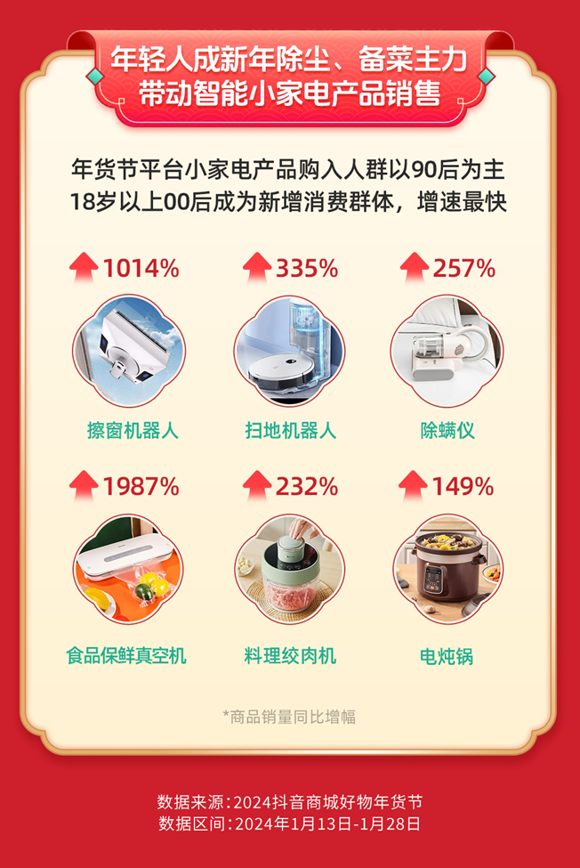 节前,越来越多年轻人参与到家庭过年筹备中。腊月除尘、除夕备菜、新春开卷……他们以不断升级的品质消费需求,拓展着年货的内涵。数据显示,年货节期间,90后成为平台内购买智能小家电产品的主力,18岁以上00后成为新增消费群体、购买增速最快。诸如擦窗机器人、扫地机器人、除螨仪等除尘产品在节前销量增长极快,达到1014%、335%和257%。年菜筹备方面,年轻人倾向于购买小家电设备辅助,提升便捷感。食品保鲜真空机销量比去年同期呈现19倍以上的增幅,料理绞肉机、电炖锅销量同比增长232%和149%。