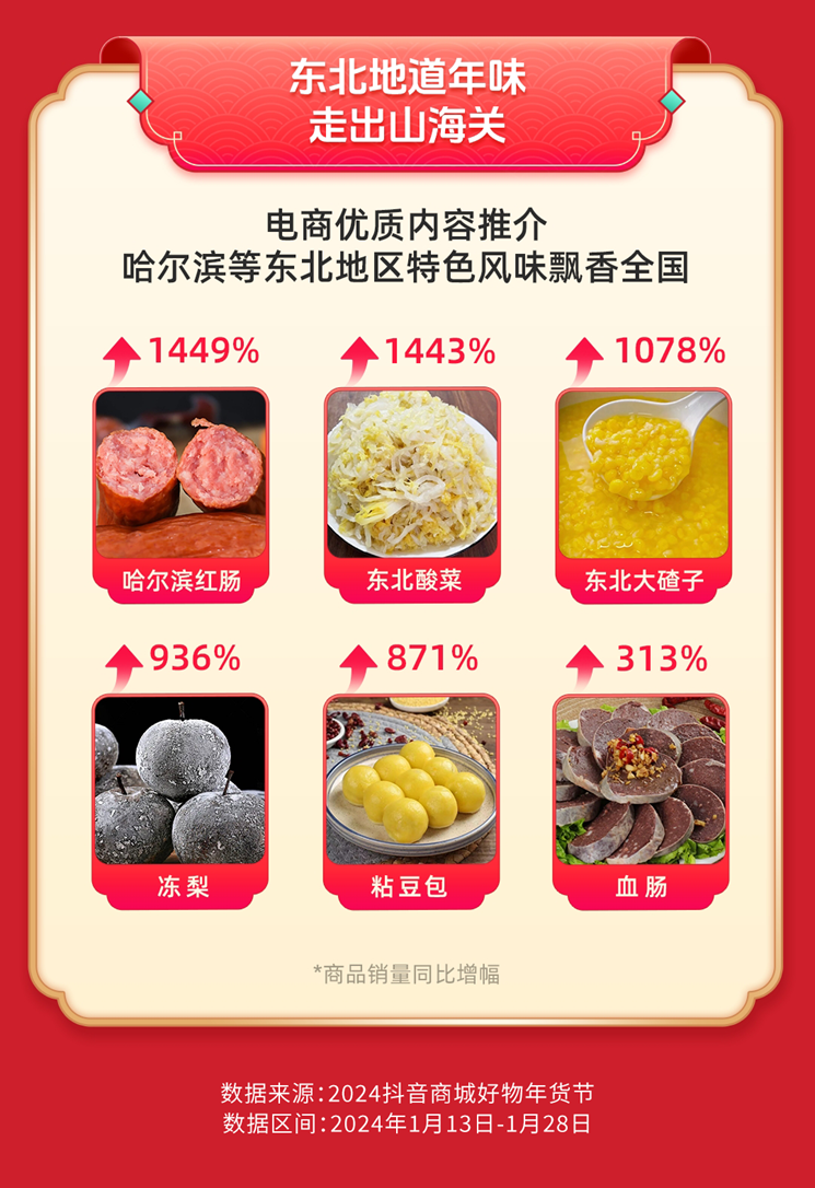 哈尔滨在这个冬天爆火出圈,将东北冰雪风光和传统美食带入更多人的视野。来自全国各地的不少家庭,还未来得及在节前成行抵达远方,便纷纷选择在抖音电商里下单,率先品尝来自东北的原汁原味。数据显示,哈尔滨红肠、东北酸菜和用来煮粥的东北大碴子,销量皆比去年增长了10倍以上,分别达到1449%、1443%和1078%的增幅。冻梨、粘豆包、血肠等特色美食,丰富了外地消费者的味蕾,销量同比增长了936%、871%和313%。