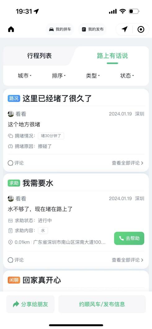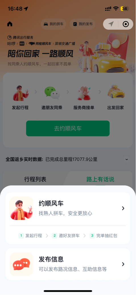 顺风车回家过年如何更“顺”?还得靠“自己拼”!小程序还上线了顺风车“自己拼”功能模块,基于微信社交生态,用户可以自行寻找拼车,拼车方式更便捷、更灵活。同时,用户发起的顺风车拼车信息将同步发布在平台信息广场,推荐给“顺路”有拼车需求的用户,方便用户一键加入。