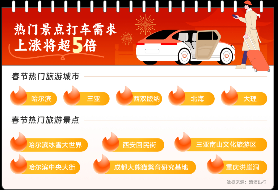 春节期间,北方冰雪游、南方避寒游的“南北互换式”旅游需求将持续走高,预计哈尔滨、三亚、西双版纳、北海、大理将是春节热门旅游城市。哈尔滨冰雪大世界、哈尔滨中央大街、成都大熊猫繁育研究基地、西安回民街、重庆洪崖洞、三亚南山文化旅游区等景点相比2019年的打车需求上涨将超过5倍。