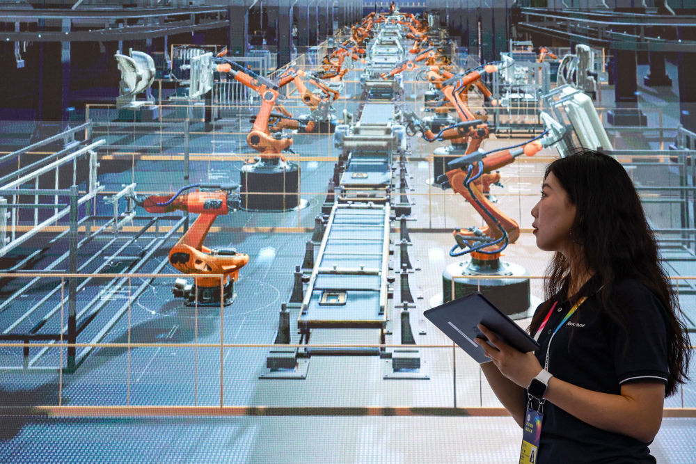 2023年5月26日,参展工作人员在数博会现场介绍腾讯云数字孪生工厂。新华社记者 欧东衢 摄