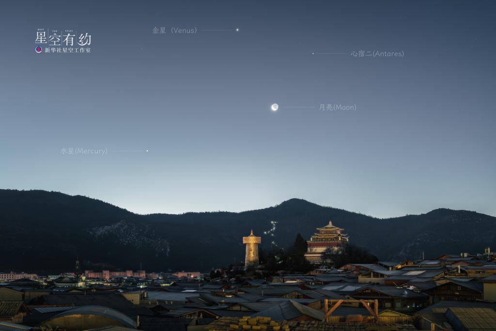 云南星空摄影爱好者张茂海2023年1月9日在云南迪庆拍制的金星、心宿二伴月。(本人供图)