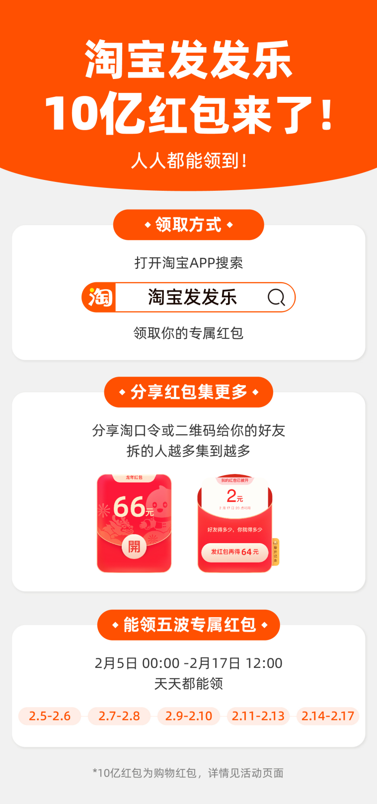 为了烘托用户春节接好运、阖家欢的氛围,“淘宝10亿红包发发乐”活动将贯穿春节全周期,从2月5日至17日12:00,分开运红包、龙年红包、拜年红包、串门红包、财神红包五波,连发13天。