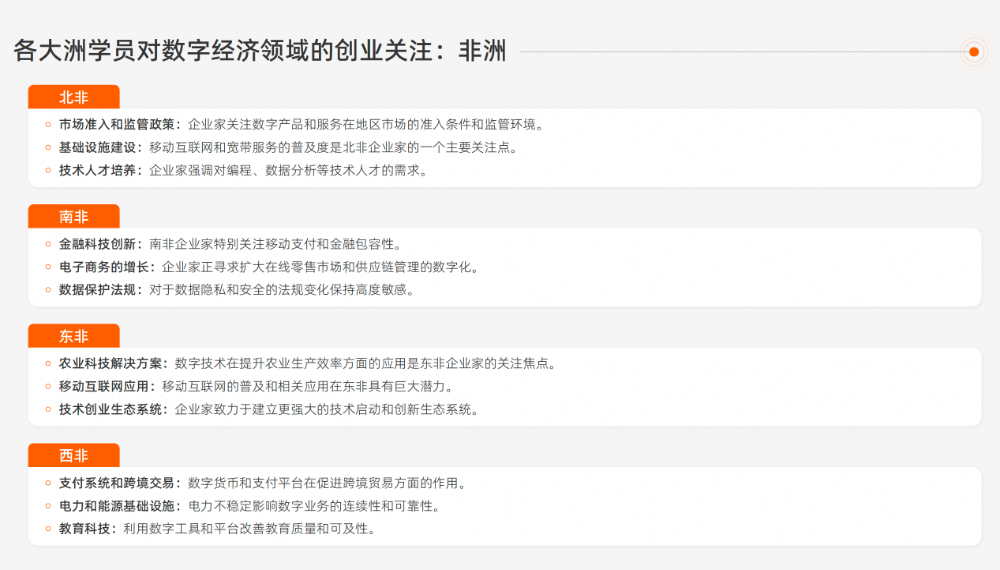 非洲创业者也在行动。来自北非的学员关注数字产品和服务的市场准入条件和移动基础设施。南非的创业者关注移动支付等金融科技创新,并积极扩大在线零售市场和供应链管理的数字化,同时对数据隐私和安全的法规变化高度敏感。蓬勃的数字创业热情也加强了对编程、数据分析等技术人才的需求。然而,电力的不稳定性也困扰着非洲尤其是西非的创业者。