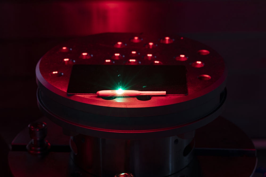 1月19日,在位于西安的中科微精总部车间,工作人员正在用超快激光微加工技术在火柴头上刻字。