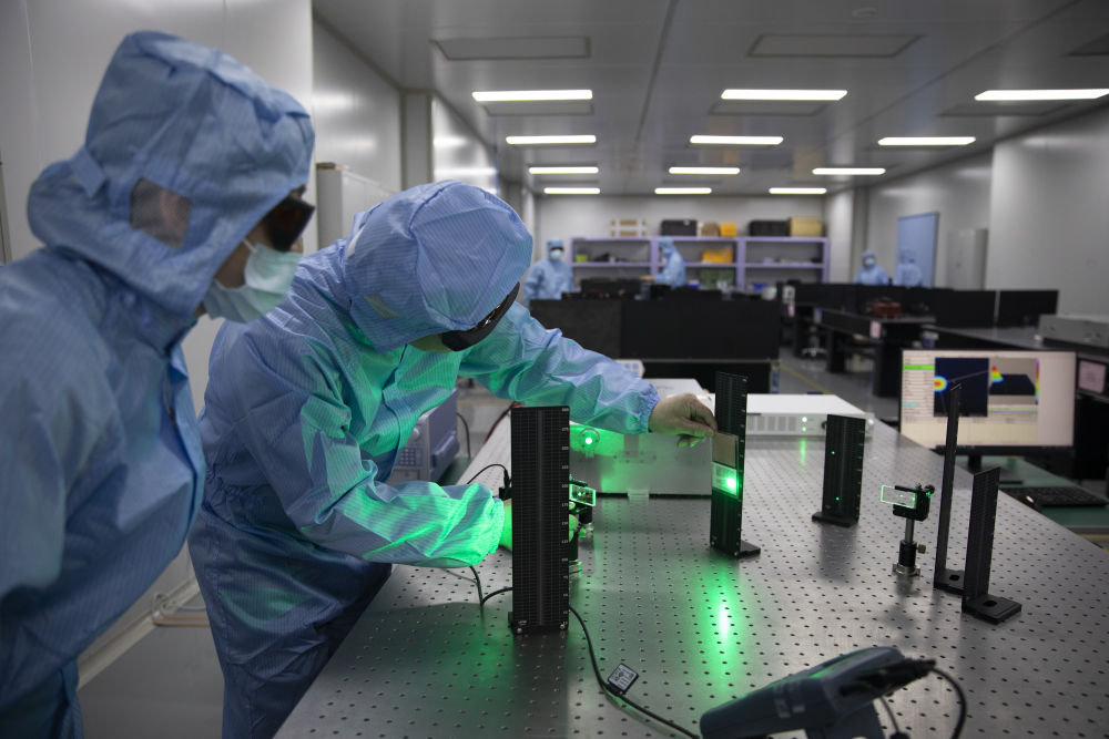 1月17日,在位于西安的中科微精总部实验室,杨小君(右)在调整实验设备。