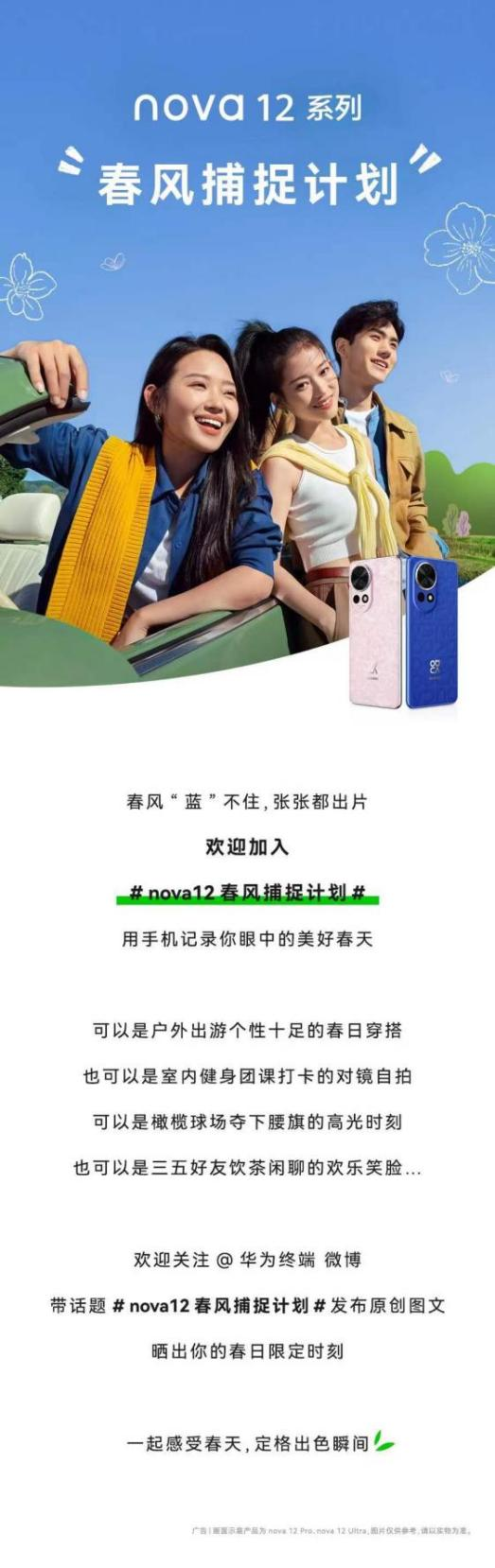 3月13日,华为终端发布nova 12系列“春风捕捉计划”活动长图。计划与更多年轻人一起感受春天,定格出色瞬间。该活动希望展现更多高校学子开学季春日场景,同时也希望可以传达出当代年轻人的精神面貌和生活态度。通过召集更多的年轻人参与到活动当中,用镜头与文字,切实反映出在生机盎然的春季与青年之间新风潮的展现,也表达出年轻人不惧表现、个性多变、在春日做自己的态度。