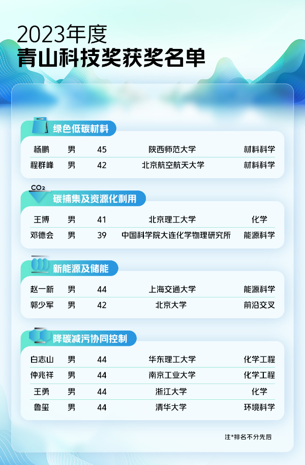 近日,第三届“青山科技奖”获奖名单正式揭晓。10位青年科研工作者凭借碳中和相关科研议题及成果参与申报并获奖,每人将获得100万元资金支持。截至目前,青山科技奖已完成三届,共支持29名在绿色低碳材料、碳捕集及资源化利用、新能源及储能、降碳减污协同控制等领域开展前沿探索的青年科学家。