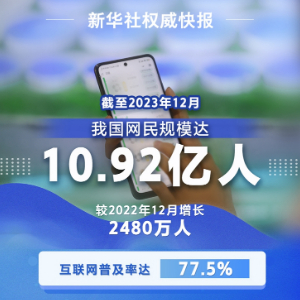 新华社北京3月22日电(王思北、林珑)中国互联网络信息中心(CNNIC)22日在京发布第53次《中国互联网络发展状况统计报告》。报告显示,截至2023年12月,我国网民规模达10.92亿人,较2022年12月新增网民2480万人,互联网普及率达77.5%。