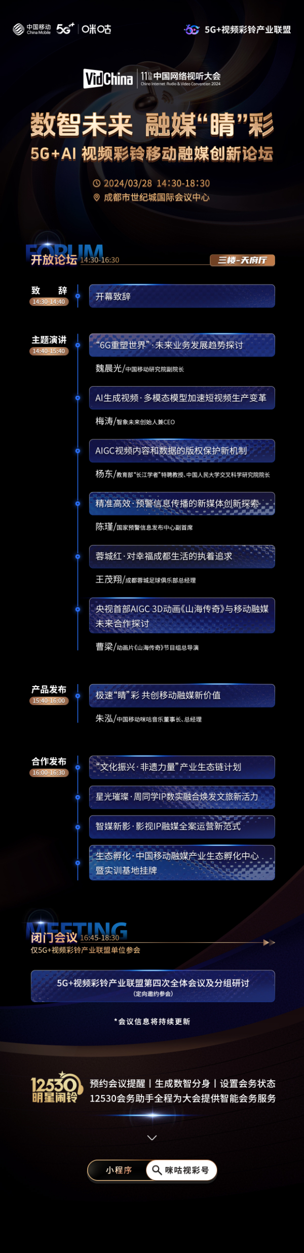 据悉,此次咪咕将围绕“5G+AI”、移动融媒+、大视频等领域集中发布系列创新成果。其中在以“数智未来 融媒‘睛’彩“为主题的5G+AI 视频彩铃移动融媒创新论坛上,咪咕将发布移动融媒全场景新生态、新合作,邀请用户公测竖屏短视频新产品。5G+、AI+等新质生产力之下,移动融媒将如何为新质内容赋能?论坛现场,咪咕将带来周同学IP数实融合焕发文旅新活力、双网互动影视全案运营新范式的创新合作发布,与会嘉宾还能聆听中国移动产业研究院、中国人民大学、国家预警信息发布中心的专家学者带来的前瞻性分享,共探行业新风向。